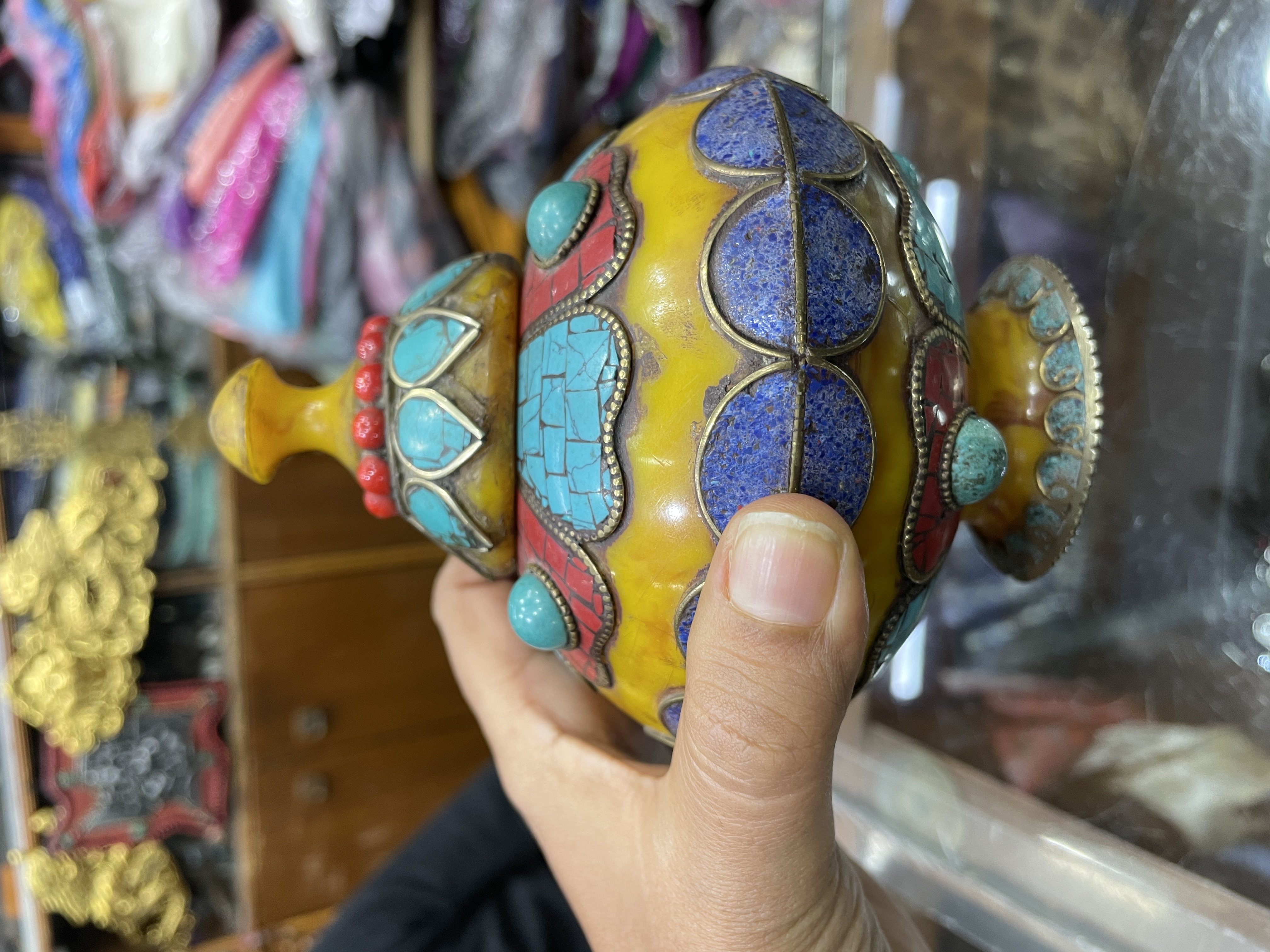 The first morning in Gangtok we visited a stupa called Do Drul Chorten which is the biggest and most significant monument in Sikkim. It is surrounded by 108 Mani Lhakor or prayer wheels. It was built by Trulshik Rinpoche , head of the Nyingma order of Tibetan Buddhism in 1945. Right next to the stupa is the Institute of Tibetology, a museum. Established in 1958, the museum holds one of the largest collections of Tibetan works in the world outside Tibet. It has very well laid out artefacts and rare collections of Thangkas. These are buddhist paintings on cotton or silk appliqué depicting buddhist culture with usually some deities.